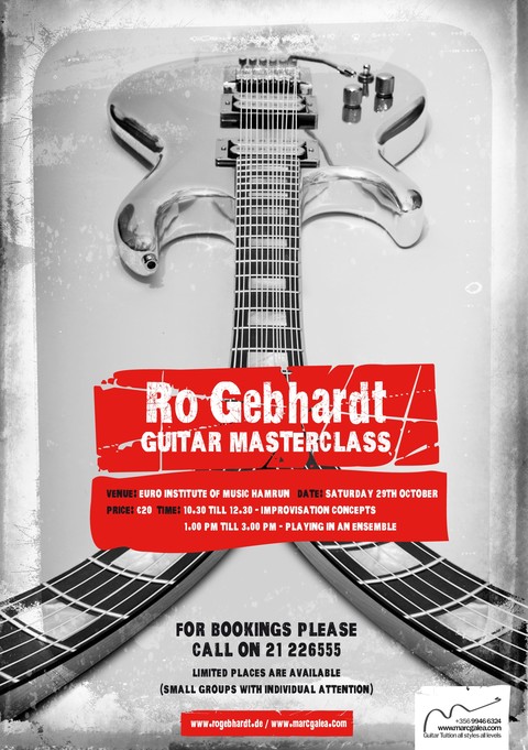 Master class by Ro Gebhardt will be held at The Euro Institute of Music in Hamrun on Saturday the 29th of October from 10:30am till 3pm. The first part of the class will focus on improvisation while the afternoon session will cover ensamble playing and useful tips for jam sessions. During the class, students will have the opportunity to ask questions to Ro Gebhardt and the possibility to jam with him. Ro is a German Guitarist with a unique voice as an instrumentalist and composer with his own sound and his own style in the world-wide scene. Master student of Mick Goodrick, John Abercrombie, students and sideman by Hal Crook. Ro has worked with legend drummer Antonio Sanchez when in 2009 released a live album.